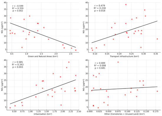 A similarly strong but negative and statistically significant relationship was observed for forests, orchards, green urban areas, and shrub vegetation (r = −0.66, p = 0.001), indicating that greener environments were associated with lower NO2 levels. These results align with other research [22] showing that vegetated and natural areas can significantly reduce NO2 exposure in urban settings. The R2 value of 0.43 makes green areas the most statistically powerful single land use predictor in this dataset, highlighting their role in mitigating air pollution.
