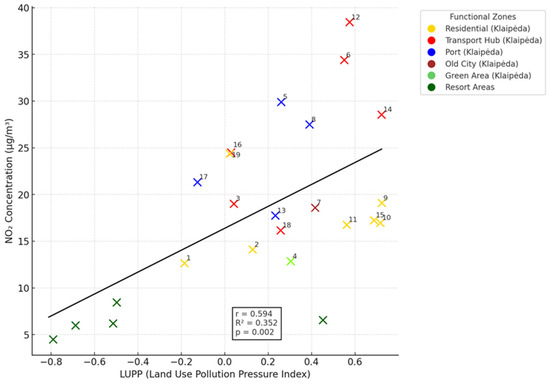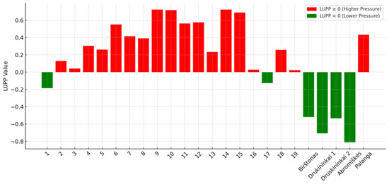 A particularly illustrative case is Palanga, which currently exhibits low NO2 concentrations but has a positive LUPP value—higher than several locations in Klaipėda. This apparent contradiction underscores LUPP’s strength as a forward-looking indicator: it does not measure pollution directly but evaluates the landscape’s structural vulnerability. In Palanga, a moderate extent of urban land and a relatively limited vegetated buffer contribute to its heightened LUPP, suggesting increased susceptibility should development or traffic intensify.
