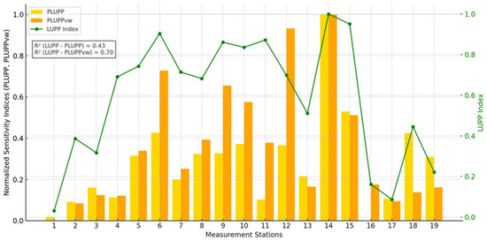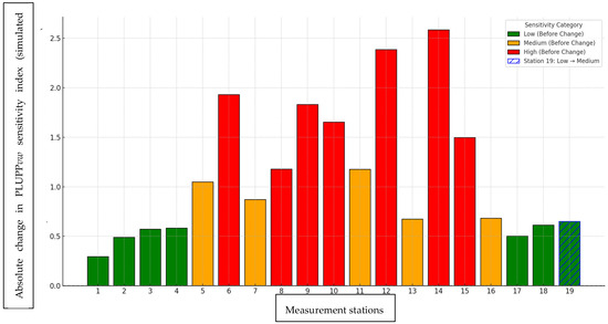 The simulation results (Figure 10) clearly demonstrate that the most environmentally sensitive monitoring stations under the hypothetical land use change scenario are also those that were already classified in the highest sensitivity category prior to the intervention. Specifically, stations 6, 12, and 14—all categorized as high before the simulation—experienced the greatest increases in the PLUPPvw. These zones represent areas where structural exposure to pollution is compounded by demographic vulnerability and limited green space availability, making them particularly susceptible to even moderate intensification of urban development.