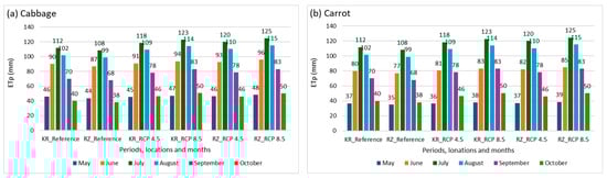 A comparison between the reference period and the projected scenarios revealed generally higher values of both standard deviation and coefficient of variation under RCP 8.5 than under RCP 4.5. Although ETp variability under RCP 8.5 remained close to that of the reference period in most months, a notable exception was September, where both the standard deviation and coefficient of variation increased markedly. This indicates enhanced variability in potential evapotranspiration, likely driven by irregular precipitation and temperature fluctuations at the end of the growing season. Overall, the variability in water requirements for cabbage and carrot was similar in both study regions.