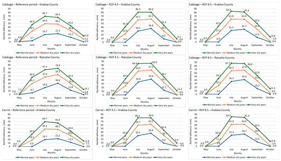 Figure 5 presents cumulative seasonal rainfall deficits. These are consistently greater under projected scenarios than during the reference period, and higher under RCP 8.5 than RCP 4.5. Rainfall deficiencies were more pronounced in Rzeszów County: seasonal cumulative deficits for cabbage reached 94.2 mm in normal years, 201.3 mm in medium dry years, and 287.5 mm in very dry years. For carrot, corresponding values were 94.2 mm, 189.6 mm, and 274.7 mm.