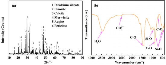 Our FTIR results (Figure 1b) demonstrated that the broad peak identified at 3450 cm−1 belongs to the O-H bond in absorbed H2O molecules [32]. The peaks ascribed to the Si-O bond in silicates were examined in the region of 500–1200 cm−1 [12,33], which are provided by dicalcium silicate, merwinite, and augite phases, corresponding to the results of the XRD analysis. The small peak identified at 2510 cm−1 represents carbonate in calcite [34]. The calcite also displays a C-O asymmetric stretching vibration (v3) band peak at 1390 cm−1, a C-O out-of-plane bending vibration (v2) band peak at 875 cm−1, and a C-O in-plane bending vibration (v4) band peak at 713 cm−1 [12,34]. Some other peaks at around 1080, 1640, and 1800 cm−1 belong to the Si-O-Si bands of the C-S-H phases [12,33]. Due to the poor crystallinity of the C-S-H phases, this phase was not identified using XRD analysis.