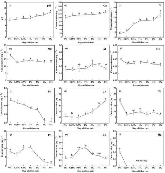 Evolution of pH and elemental release concentration of CAS-fertilized soil as a function of slag addition rate: (a) pH, (b) Ca, (c) Si, (d) Mg, (e) Al, (f) Mn, (g) Fe, (h) Cr, (i) Ni, (j) Pb, (k) Cd, and (l) Hg. Lowercase letters indicate statistical significance at p < 0.05 in accordance with Duncan’s test, and the error bars represent the standard deviation (SD).