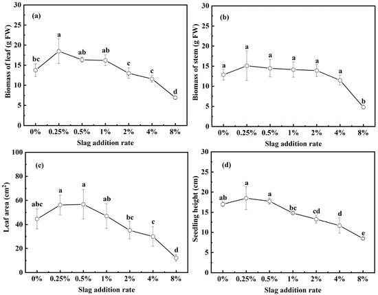 Evolution of the biomass, leaf area, and seedling height of pakchoi seedlings as a function slag addition rate: (a) biomass of the leaf, (b) biomass of the stem, (c) leaf area, (d) seedling height, and (e) pakchoi seedling images after germinating for 28 days. Lowercase letters indicate statistical significance at p < 0.05 in accordance with Duncan’s test, and the error bars represent the SD.