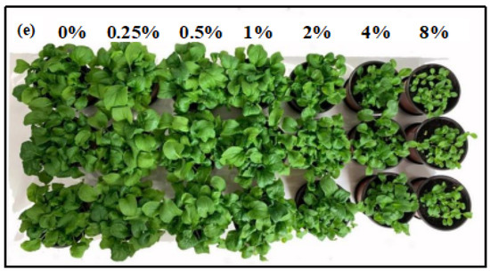 The leaf area, biomass, and seedling height were measured using the fresh sample, expressed as fresh weight (FW). The chlorophyll content of the pakchoi leaves was determined using a UV-1800 ultraviolet–visible (UV-VIS, produced by Shimadzu Corporation, Lzumo, Japan) spectrophotometer. Approximately 0.2 g of the fresh mass leaf was crushed in a mortar with 2 mL of 80% acetone to extract the chlorophyll. The obtained extract was placed in a 10 mL test tube. Next, the utilized mortar was rinsed using 2 mL of 80% acetone and the content thereof was placed in a test tube. Subsequently, 80% acetone was added to the test tube to produce a final volume of 10 mL. After centrifugation at 10,000 rpm for 5 min, the solution was detected using the UV-VIS spectrophotometer at absorbances of 663 nm and 645 nm, respectively. Chlorophyll content measurement was repeated in triplicate. The chlorophyll a, chlorophyll b, and total chlorophyll contents were determined using the following equations: