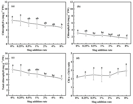 Chlorophyll content is a vital factor in determining the effects of treatment on photosynthetic ability and net primary production, correlating with plant growth [36]. As depicted in Figure 4a–c, the CAS treatment reduced the chlorophyll contents (both chlorophyll a and chlorophyll b) of the pakchoi seedlings, primarily due to the decreased Fe and Mg leached concentrations, with the decrease in Fe being particularly pronounced [37]. As depicted in Figure 4d, the reduction in chlorophyll content was accompanied by an improved chl a–chl b ratio. This finding indicates that the degradation rate of chlorophyll a is lower than that of chlorophyll b.