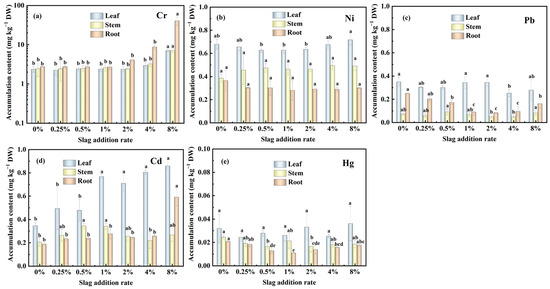 The results presented in Figure 5a–e demonstrate that increasing the CAS fertilization rate enhances the Cr and Cd accumulation rates of the pakchoi seedlings; in comparison, this treatment has little effect on the accumulation rate of Ni, Pb, and Hg. The accumulation rate of Cr follows the order of root > stem > leaf; that of Ni, Cd, and Hg follows the order of leaf > stem > root; and that of Pb follows the order of leaf > root > stem in the pakchoi seedlings. These findings indicate that the upward migration rate of Cr from the root to the leaf is slow in the pakchoi seedlings. Following the absorption of heavy metals from the soil into the pakchoi, the absorbed Cr preferentially accumulated in the roots; in comparison, Ni, Cd, Pb, and Hg preferentially accumulated in the above-ground parts. This pattern may be attributed to the fact that the upward migration rate of Ni, Pb, Cd, and Hg in the pakchoi seedlings is faster than that of Cr. It is noteworthy that Cd accumulation in the roots was higher than in the stems at slag addition rates of 4% and 8%. This finding may be attributed to the increased pH, impacting the migration rate of Cd.