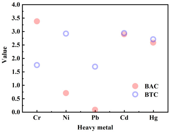 To study the migration mechanism of heavy metals (e.g., Pb, Hg, Cd, Ni, and Cr) from the soil to pakchoi, the biological transfer coefficient (BTC) and the biological accumulation coefficient (BAC) were determined using Equations (4) and (5) [27,28], respectively: