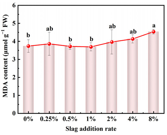 Heavy metal accumulation in plants results in multiple toxic effects by inducing reactive oxygen species (ROS) production, including H2O2, O2−, O3, and 1O2 [42]. MDA, a decomposition product, content was examined to investigate the effect of CAS fertilization on the extent of ROS damage to the pakchoi seedlings. As illustrated in Figure 7, the MDA content of the pakchoi seedlings did not increase compared with the control with low rates (0.25–1%) of CAS fertilization. At slag addition rates of 2%, 4%, and 8%, however, the MDA content increased by 6.1%, 10.7%, and 21.4%, respectively. As demonstrated in the results, the low rates (0.25–1%) of CAS fertilization did not increase the extent of ROS damage to the pakchoi seedlings. Notably, high rates (≥2%) of CAS fertilization induced the upregulation of ROS damage level. Moreover, the change trend of the MDA content was similar to the Cr accumulation rate. Thus, Cr accumulation in pakchoi seedlings may primarily lead to enhanced ROS damage through CAS fertilization. To avoid potential heavy metal damage to the soil–plant system through the use of CAS as a fertilizer, specific mitigation strategies can be implemented, such as the application of biochar, appropriate irrigation and water management, and planting crop cultivars with low heavy metal accumulation [46].