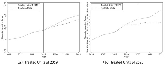 Figure 2 aggregates the treated cities according to the policy implementation years (2019, 2020) to compare the overall effects of the policy at different points in time. It can be seen that the initial fitting of the two graphs is quite good, with the treatment groups in 2019 and 2020 showing clear deviations from the synthetic path after the pilot was launched, thus reinforcing the dynamic verification of the overall effect of the digital RMB policy; the 2020 pilot group began to diverge from the synthetic path in 2019, possibly because some pilot cities had already deployed financial infrastructure before the official announcement. Nevertheless, the path divergence further expanded after the pilot began, still indicating that the overall direction of the policy had a substantial impact.