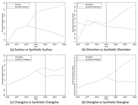 Figure 3 shows the changes in financial inclusion in the four cities (Suzhou, Shenzhen, Changsha, and Shanghai) before and after the pilot policy, along with their dynamic comparison with the synthetic control group. In general, the financial inclusion levels in these pilot cities were higher than those in the synthetic control group after the pilot began, and the gap gradually widened over time, indicating that the digital RMB pilot had a certain positive impact on improving the inclusiveness of financial services.