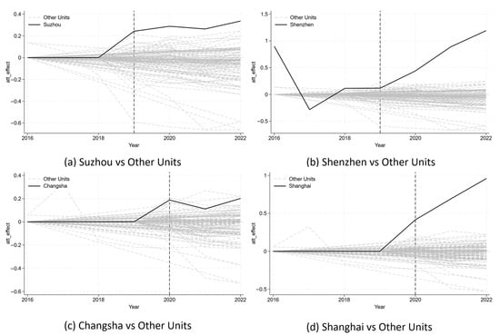 Figure 6, the black solid line represents the synthetic residual path for the actual treated city, and the gray dashed lines represent the synthetic residual paths for all placebo cities. A clear divergence emerges between the treated and placebo units after policy implementation, with the black line visibly higher than most gray lines. In particular, Suzhou and Changsha exhibit rapid divergence from their control groups after the pilot, while Shanghai shows a steady upward trend. Though the pre-treatment fit for Shenzhen is slightly less accurate, it still displays a clear positive deviation post-intervention, confirming the significance of its policy response.