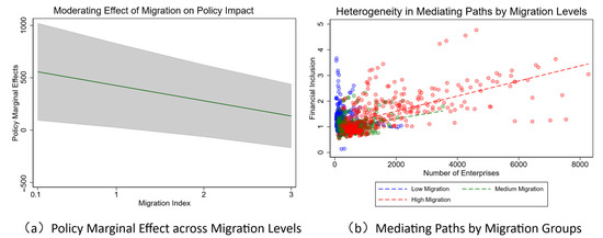 Figure 7 provides a visual illustration of this pattern. In the left panel, cities with low migration levels show significantly greater policy-induced increases than those with high migration, whose confidence intervals are close to zero, indicating a minimal net effect. The right panel groups cities into low, medium, and high migration levels. Scatter plots and group-specific regression lines reveal that in high-migration cities, although the slope linking merchant coverage to financial inclusion is steeper, it exhibits greater volatility. By contrast, low-migration cities display more stable gains in financial inclusion from increased merchant coverage, supporting the distinction between the “fill-in” and “crowding-out” effects and reinforcing the results from