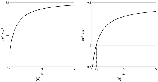 Comparison of equilibrium social welfare between Scenarios and . Note: (a) , , , and ; (b) , , , and .