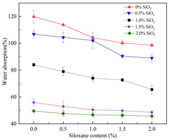 The water absorption of the waterborne polymer coating films was significantly affected by the concentrations of PVA, PVP, CS, and starch (Table 2). With the raw material ratio changing, the WA of the waterborne polymer coating films ranged from 119.86% to 186.35%. When the concentrations of PVA, PVP, CS, and starch were 4%, 3%, 3%, and 3% (W3 treatment), respectively, water absorption was the lowest, being 19.96–35.68% lower than the values obtained under other W treatments. Previous studies have shown that a coating film with lower water absorption shows a better controlled-release performance [24]. To further improve the N-release properties of the waterborne polymer coatings, nano-SiO2 and siloxane were employed to modify the W3 polymer coatings. Figure 1 illustrates the water absorption behavior of the hydrophobic waterborne polymer films with different nano-SiO2 and siloxane contents over a period of 3 h. With the content of nano-SiO2 increasing from 0.0% to 2.0%, water absorption significantly decreased from 119.86% to 49.60%, a decrease of 58.62%. With the addition of siloxane, water absorption further decreased. When the contents of nano-SiO2 and siloxane were 2.0% and 1.5%, respectively, the water absorption of hydrophobic waterborne polymer films decreased to 46.35%, which was 61.33% lower than that achieved under W3 treatment. The reduction in water absorption may be attributed to two main factors. First, if the waterborne polymer forms a network structure via polymer chain reactions with nano-SiO2 and the excess −OH groups are bonded together, then the number of hydrophilic groups would decrease [23]. Second, the addition of siloxane may promote the cross-linking of the waterborne polymer coating, and the hydrophobic nature of the siloxane component may further decrease water absorption [4].