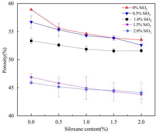 Coating films with higher porosity may lead to a higher absorption of water. Moreover, with the absorption of water, the coating films undergo swelling, and then, intermolecular spacing increases [4]. These factors might enhance the transmembrane transport of N within the coating film, leading to a poorer N-release characteristic. Therefore, the water absorption rate and porosity of the waterborne polymer coatings play a key role in determining the performance of the slow-release waterborne-polymer-coated urea. Figure 2 shows that siloxane and nano-SiO2 exert a significant effect on the porosity of the hydrophobic waterborne coating films. The coating film without siloxane and nano-SiO2 exhibited higher porosity (58.91%). With the addition of nano-SiO2, the porosity of the hydrophobic waterborne coating film significantly decreased. When the content of nano-SiO2 increased to 2%, the porosity of the hydrophobic waterborne coating film decreased to 45.89%, which was 22.10% lower than that for treatments without siloxane and nano-SiO2. Furthermore, with the content of siloxane increasing from 0% to 1.5%, the porosity of the hydrophobic waterborne coating film significantly decreased. However, with the content of siloxane further increasing, the porosity remained almost unchanged.