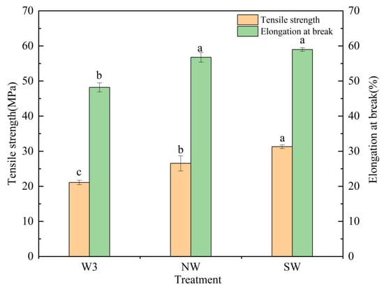 The mechanical strength of waterborne coatings is a critical parameter in evaluating coating performance [25]; therefore, the influence of nano-SiO2 and siloxane on the mechanical properties of the waterborne coatings was investigated. As shown in Figure 3, after nanomodification, the tensile strength and elongation at break of NW coatings significantly improved to 26.54 MPa and 56.75%, suggesting a 25.84% and 17.78% increase, respectively, compared to those for the W3 treatment. This phenomenon may be attributed to the enhanced cross-linking density between the waterborne polymer and the inorganic networks. Furthermore, the nanoparticles were confirmed to be uniformly distributed throughout the polymer matrix, functioning as effective reinforcing fillers [26,27]. With the addition of siloxane, the tensile strength and elongation at break further improved, probably owing to the increase in hydrogen bonding and cross-linking [25,28]. These results indicate that the addition of nano-SiO2 and siloxane makes the waterborne polymer coatings stronger.