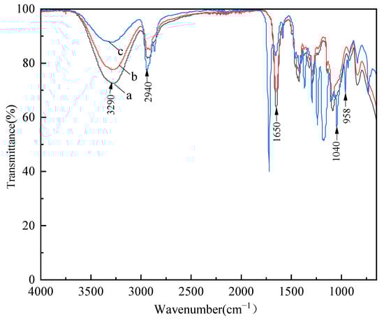 The FT-IR spectra of the waterborne polymer coating (Figure 4a), nanomodified waterborne polymer coating (Figure 4b), and hydrophobic modified waterborne polymer coating (Figure 4c) revealed the chemical transformations during the synthesis process. In Figure 4a, the 2940 and 1650 cm−1 absorption peaks are assigned to C–H stretching and N–H bending vibrations, respectively [1,29]. The 3290 cm−1 absorption peak belongs to –OH stretching, which is directly correlated with the water absorption capacity [30]. Extensive spectroscopic investigations have established that the higher transmittance of –OH groups indicates a higher water absorption potential [31]. After hydrophobic modification, the peaks correlating to the –OH groups of NW and SW weakened (Figure 4b,c). Furthermore, the new peaks assignable to Si–O and Si–O–Si appeared at 1040 and 958 cm−1 for the SW treatment, indicating the hydrophobic modified waterborne polymer coating was successfully fabricated.