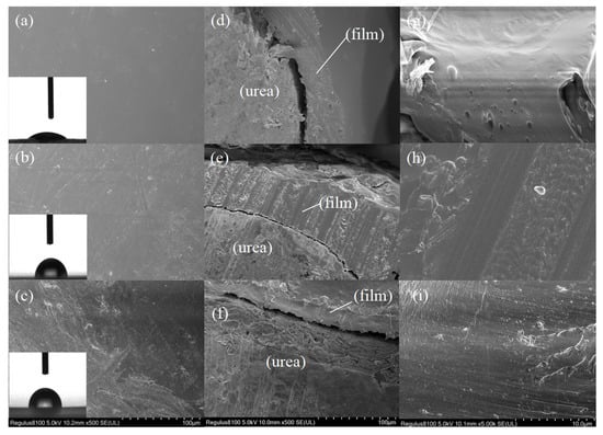 Siloxane and nano-SiO2 were employed to enhance the hydrophobicity of the waterborne polymer coatings. SEM analysis confirmed that the surface of the WCU coatings was smooth (Figure 5a), and abundant micropores were observed on the fracture surface of WCU (Figure 5g). Furthermore, the WCA of WCU coating shells was 46.5° (Figure 5a), which may facilitate water/nutrient penetration or water/nutrient release from the coatings shells and then accelerate the N-release rate [32,33]. In comparison, the coating structures of NWCU (Figure 5e,h) and SWCU (Figure 5f,i) were more compact than that of WCU (Figure 5d,g). Furthermore, many hierarchical micro–nanoscale structures were observed on the surface and fracture surface of NWCU (Figure 5b,e) and SWCU (Figure 5c,f), and the WCAs of NWCU and SWCU were 87.2° and 89.3° (Figure 5b,c), respectively, which were 87.53% and 92.04% higher than those for WCU, respectively. Micro–nanoscale structures can help enhance the roughness and hydrophobicity of NWCU and SWCU, thereby improving their water resistance ability and N-release period.