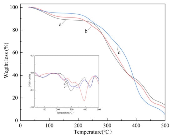 TGA and DTG curves of WCU (a), NWCU (b), and SWCU (c).