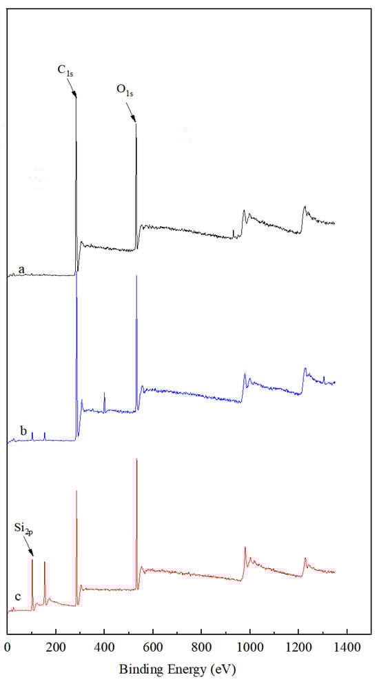 The elemental compositions and chemical valence of the WCU, NWCU, and SWCU coatings were analyzed using XPS analysis, and the results are illustrated in Figure 7 and Figure S1. In the major XPS spectrum of the WCU coating (Figure 7a), 286 and 533 eV correspond to C1s and O1s, evidencing the existence of oxygen and carbon in the waterborne polymer coatings, respectively. After siloxane and nano-SiO2 modification, the XPS spectra for the NWCU and SWCU coatings showed 102 eV, which correspond to Si2p (Figure 7b,c). These results indicate that siloxane and nano-SiO2 were incorporated into the modified waterborne coatings [10,36]. The XPS analysis revealed chemical transformations during the modification process and confirmed the successful modification of the waterborne coatings with siloxane and nano-SiO2.