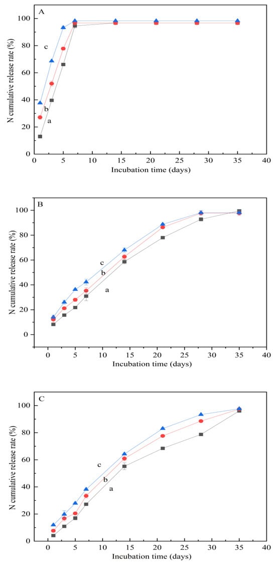 Cumulative nitrogen-release dynamics of WCU (A), NWCU (B), and SWCU (C). a, b, c represent 40%, 60%, and 80% field capacity, respectively.