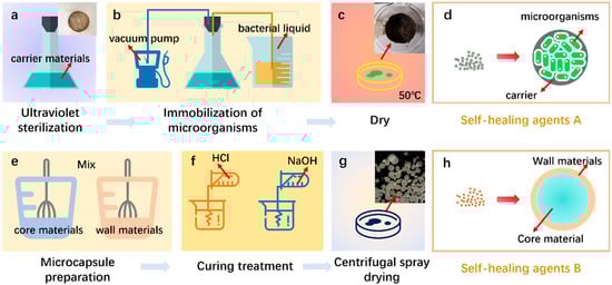 Figure 1a–d. The carrier materials need to be sterilized under ultraviolet light and then placed in a vacuum filtration bottle before the experiment. A vacuum pump is used to achieve an internal vacuum of −0.06 MPa. The throttle valve is then opened to allow the culture solution of the domesticated mutant strain, which has been amplified and cultured for 48 h, to be absorbed into the vacuum filtration bottle under negative pressure. After 24 h of vacuum adsorption, the throttle valve is closed, and the filtration bottle is opened to obtain the complex of microorganisms and carrier materials. Subsequently, the composite material is placed in a 50 °C blast drying oven and dried to a constant weight, resulting in microorganism-loaded carriers, which were recorded as microbial self-healing agent A.