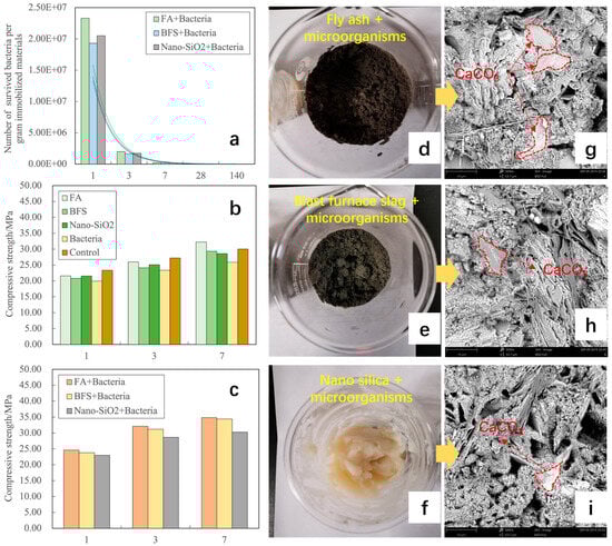 Figure 2i, the surface of the calcium carbonate crystals is covered with numerous cement hydration products and nano-silica particles. Overall, the large specific surface area and porous nature of fly ash provide a suitable environment for microbial survival, which is conducive to microbial viability and calcium carbonate biomineralization.