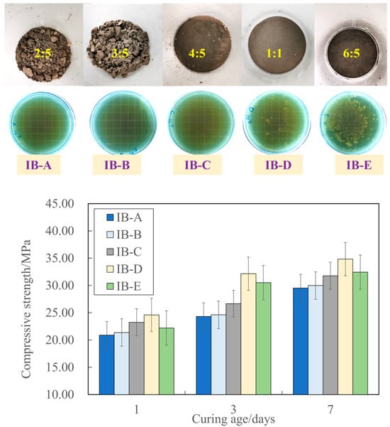 2), the sample becomes damp and aggregates into lumps, which remain clumped and blocky even after drying. This non-uniform dispersion is not conducive to addition in the cement slurry and leads to issues with uneven microbial solid loading. Therefore, using fly ash as a carrier for microorganisms is more beneficial for achieving a uniform distribution within the carriers, which in turn helps to increase the number of microorganisms.