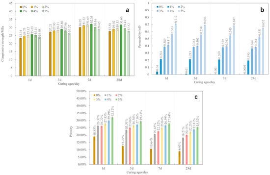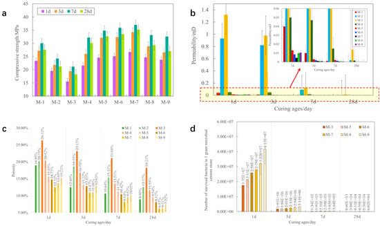Figure 7c. This effective reduction in porosity, driven by both cement hydration and microbial mineralization processes, contributes synergistically to the observed decreases in permeability and the enhancement of compressive strength, which is similar to the results in the references [