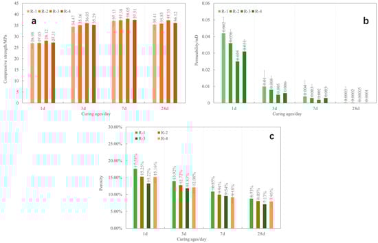 Among the four tested formulations, the combination containing 3% microorganism-loaded carriers and 3% calcium chloride sustained-release microcapsules achieves the highest compressive strength, highlighting its superior structural integrity. Complementing the strength development, the cement stone’s permeability undergoes a marked reduction over time, with the most dramatic improvements occurring in the initial curing stages, as illustrated in
