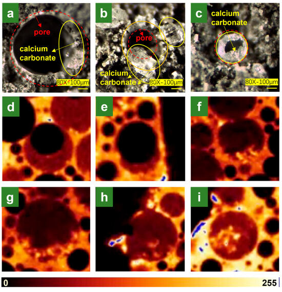 Figure 8a–c, mineralized products are observed within the internal pores of the microbial well cement stone. Larger crystals are embedded in the cement hydration products surrounding these pores. Furthermore, more prominent spherical sedimentary crystal structures with hollow interiors are evident, suggesting a propensity for microbial mineralization to favor spherical crystal formation. However, due to the small pore sizes in the original microbial well cement stone and the limited resolution of CT scans, direct observation of mineralization product distribution within the pores using CT alone is challenging. To overcome this limitation, a foaming agent was incorporated into the microbial well cement slurry in this study, resulting in a porous microbial well cement stone with artificially enlarged pore sizes. This modification facilitated the visualization of mineralization product growth within the pores under the achievable CT resolution.