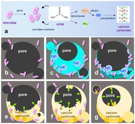Figure 9a–g). Following water intrusion, a portion of the fluid flows through the pore throats, initiating pore filling. Due to gravitational forces, the fluid initially accumulates at the bottom of the pores and gradually fills the entire pore. Some of this fluid penetrates the cement matrix, triggering the sustained-release microcapsules within the microbial well cement stone to release more calcium chloride and nutrients. Simultaneously, provided sufficient nutrients and water are available, the microorganisms become activated, metabolize, and produce carbonate ions.