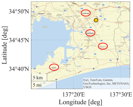 Rainfall observation sites (Toyohashi, Futagawa, Toyokawa, and Tahara). The orange circle indicates the location of the river discharge observation station for the Toyo River (large river), Tougo Station.
