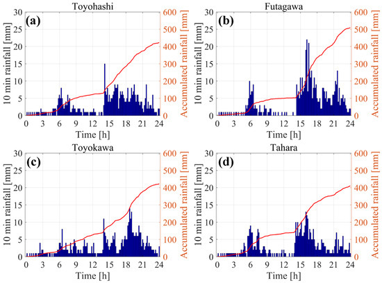 Ten min rainfall (blue bar) and 24 h accumulated rainfall (red line). (a) Toyohashi, (b) Futagawa, (c) Toyokawa, and (d) Tahara.