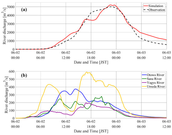 First, before the hindcast experiment of the inundation, the results of the hindcast simulations of the river discharge, which is the input condition for iRIC, were verified. The reproducibility of the river discharge was discussed using the observed values at the Tougo observation station on the Toyo River (Figure 4). The maximum river discharge simulated by the RRI was 5214.4 m3/s (2 June 2023, 22:30 JST), and the observed value was 5023.6 m3/s (2 June 2023, 23:00 JST). The Nash–Sutcliffe efficiency (NSE) coefficient was used to evaluate the overall trend [32]. The NSE during the river flood period (2 June 2023, 0:00 JST–3 June 2023, 12:00 JST) was 0.94, indicating that the change in discharge was reproduced with high accuracy.