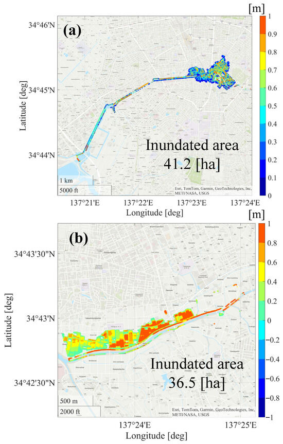 Inundation simulation results using iRIC. (a) Yagyu River. (b) Umeda River.