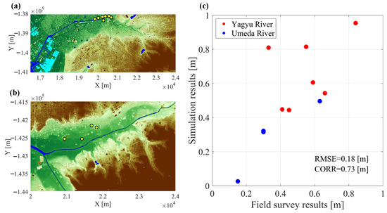 Next, the inundation simulations are discussed using iRIC (Figure 5). It should be noted that all inundations in this study only covered external flooding and did not include inland flooding. First, regarding the inundation of the Yagyu River (Figure 5a), the inundated area was approximately 41.2 ha. The flooding occurred in the midstream of the river (Figure 1c), and the overflow point is consistent with the results of the trace height and onsite interview surveys. Furthermore, the overflow began on 2 June 2023 at 16:30 JST, which matched the observed time. The area around the overflow point was constructed with a levee height of 4.4 m, but the river width changes significantly, narrowing by approximately 30%, from 30 m upstream to 20 m downstream. Therefore, when the high upstream river flow flowed down the narrow section, the water level increased significantly and led to the overflow. Next, regarding the inundation of the Umeda River (Figure 5b), the inundated area was approximately 36.5 ha. As with the Yagyu River, flooding occurred in the midstream of the river, and overflow occurred only on the right bank. These results are consistent with the trace height survey. Three overflow points were confirmed, with one upstream and one downstream on either side of the bridge, and one further downstream. Furthermore, the overflow began at the three points in the Umeda River on 2 June 2023, at 16:10 JST, with an error of approximately 20 min from the observed time. Based on the results of the trace height survey conducted on 3 June 2023, the accuracy of the reproduction experiment was verified (Figure 6). In the field survey report, the water level trace height was measured at seven points on the Yagyu River (Figure 6a,c) and four points on the Umeda River (Figure 6b,c). When comparing the inundation depth at the same points using iRIC, the root mean square error (RMSE) for the two rivers was 0.18 m, and the correlation coefficient was 0.73, confirming high reproducibility. As the results were appropriate for the inundation depth as well as the overflow location and overflow start time, it was determined that the reproduction simulations using iRIC were valid.