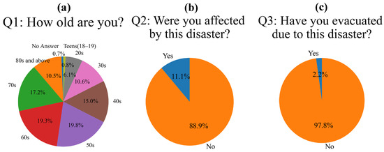 The questionnaire response rate was high at approximately 43%. When checking the age distribution, responses from all generations over 30 years of age accounted for >10% of responses, confirming that cooperation was received from a wide range of age groups (Figure 8a). In particular, residents in their 50s and 60s accounted for approximately 40% of responses, indicating that they had a positive attitude toward the questionnaire. However, when asked if they were affected by the disaster, approximately 90% of households answered “No”, and the number of affected households was small compared to the scale of the disaster (Figure 8b). Furthermore, when the affected residents were asked whether they had evacuated (Figure 8c), the evacuation rate was approximately 2.1%, which was very low. Therefore, it became clear that there were a certain number of residents who remained in their homes even if they were affected by the disaster. Of the residents who evacuated, only six households (0.28%) evacuated to evacuation sites designated by the local government, and most evacuated to the houses of relatives on nearby high ground or away from rivers. The evacuation rate to designated evacuation sites as determined by Toyohashi City Hall was 0.1%, the number of evacuated households divided by the total number of households as of April 2023, showing a generally similar trend. Spatial analysis of evacuation behavior revealed that proximity to rivers alone did not significantly influence the decision of residents to evacuate. While overall evacuation rates remained low across the city, school districts located in the midstream area of the Yagyu River, where flood simulations indicated inundation depths of approximately 1 m and dense urban development, exhibited comparatively higher damage and household evacuation rates (4.8%). In contrast, although tidal conditions contributed to severe flooding in downstream areas of the Yagyu River, certain districts in these zones reported lower household evacuation rates (2.6%) than midstream districts. This disparity between flooding and behavioral response suggests gaps in risk perception, preparedness, or information dissemination within those downstream communities. Districts near the Umeda River, which are predominantly agricultural with lower residential density, showed minimal differences in both damage and evacuation behavior. These findings indicate that flood exposure and the responses of residents are shaped not solely by geographic proximity, but by a combination of land use patterns, community structures, and localized awareness of risk.