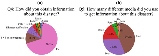 Regarding this flood event, in response to “Q4: How did you obtain information about this disaster?”, approximately 70% of respondents cited television as their primary source (Figure 9a). Another 20% reported using social media, internet news, and disaster prevention notification applications on smartphones, indicating that a range of digital platforms supported emergency awareness. While these immediate information channels played an essential role, simulation results revealed that compound flooding along the Yagyu River—amplified by tidal conditions—was especially severe in downstream areas. Notably, residents in these districts had experienced similar flood events during the 2008 disaster. Interviews showed that beyond relying on mass media and digital alerts, several residents actively applied lessons from the 2008 experience to inform their responses during the 2023 event. In particular, heightened awareness of flooding risk during high tide was cited as a decisive factor in preparedness and evacuation decisions. These findings suggest that disaster response among residents was shaped by a dual framework: real-time information access and the integration of historical, lived experience. Together, these factors highlight the importance of combining technological communication strategies with community-based memory in future preparedness planning.