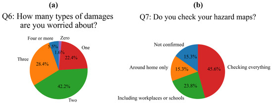 Furthermore, in response to “Q5: How many different media did you use to get information about this disaster?”, approximately 40% answered that they used only one information source, approximately 30% answered that they used two, and approximately 20% answered that they used three information sources (Figure 9b). It became clear that approximately 60% of residents used multiple sources to obtain disaster-related information. Next, in response to “Q6: How many types of damage are you worried about (housing, infrastructure, fields, automobiles, etc.)?” (Figure 10a), approximately 20% of residents answered only one (all answered damage to housing), while the remaining 80% of residents were also highly concerned about damage other than housing. Damage other than housing included infrastructure-related damage such as electricity, gas, and water supply, as well as traffic disruptions due to the suspension of public transportation and flooded roads. Furthermore, as Toyohashi City is an agriculturally rich region, some respondents expressed concern about damage to farmland. In this study, the term “hazard map” refers to flood inundation assumption maps published by local governments in Japan. These maps show expected inundation zones along specific rivers under various rainfall scenarios and serve as important tools for disaster prevention planning. In response to “Q7: Do you check your hazard map?” (Figure 10b), approximately 46% of residents answered that they checked all hazard maps that were relevant to them, such as home, workplace/school, and commuting route. Approximately 24% of residents answered that they checked their home and workplace/school, approximately 15% answered that they only checked the area around their home, and approximately 15% answered that they had not checked any map. As this flood disaster occurred on a weekday from early afternoon to early evening, it is likely that many residents faced river flooding at their workplace/school or on their commuting route. It is assumed that improving understanding of hazard maps for locations other than homes will lead to future disaster prevention.