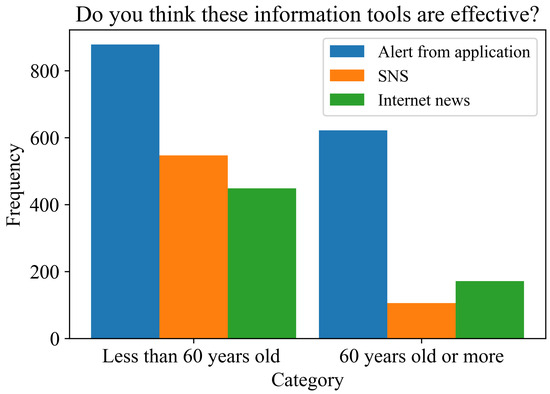 Finally, to understand the most effective way of providing information for possible future flood disasters, residents were asked about their information sources (Figure 11a), the number of media they used (Figure 11b), and the disaster prevention events they would like to join (Figure 11c). First, regarding the sources of information, a variety of answers were given to “Q8: What disaster prevention information do you think is the most useful? (other than hazard maps)” (Figure 11a). The most useful source for people was TV programs, cited by approximately 28% of residents. The second most useful source was the Emergency Alert System broadcast on TV or in the residential area, cited by approximately 23% of residents, and in third place was circular notices in the residential area (approximately 19% of residents). Additionally, social media, such as smartphones, and electronic media, such as simple notification service (SNS), internet news, and emergency notifications on a phone, collectively accounted for approximately 15% of residents. In response to “Q9: What information media do you think is effective for disaster prevention?” (Figure 11b), approximately half of residents answered two or fewer types, and of the remaining half, approximately 41% answered three or four types. Overall, 99% of residents had one or more methods of obtaining information, and approximately half of residents used three or more sources of information and could obtain more accurate disaster information. The questionnaire results showed that the number of sources of information fluctuated, particularly in the use of electronic devices, such as smartphones and PCs. Therefore, an analysis of disaster information using electronic devices was also conducted based on the age of the respondents (Figure 12). To divide the respondents into two approximately equal groups, those residents who provided their age were categorized into groups of 60 years old and over (1111 residents) and under 60 years old (1001 residents). As a result, no significant difference was found by age in whether emergency notifications, such as applications, were effective or not, but a significant difference was found by age in the use of SNS and internet news (significance level = 5%). Emergency notifications, such as applications, are push-type information, and information is delivered to the user without the need to operate an electronic device. However, SNS and internet news require the user to obtain information voluntarily. As a result, a significant difference was found between the younger group, who were accustomed to using electronic devices, and the older group. For “Q10: How many disaster prevention events would you like to participate in in the future?” (Figure 11c), approximately 45% of residents answered that they would not participate, while approximately 55% of residents were willing to participate in at least one event. Most residents who answered that they would not participate gave the reason that they “did not have enough time to participate”. Among the events that residents would like to participate in, the most popular answer was “local disaster prevention training,” which was answered by 54% of those residents who indicated their intention to participate. This was followed by a disaster prevention symposium (27%). To encourage more residents to participate in disaster prevention events, it is necessary to increase flexibility by making online educational materials available and using online meetings. In particular, it is desirable to widely communicate to many residents the latest knowledge regarding disaster mechanisms, as analyzed in Section 3.2, or evacuation shelter management.
