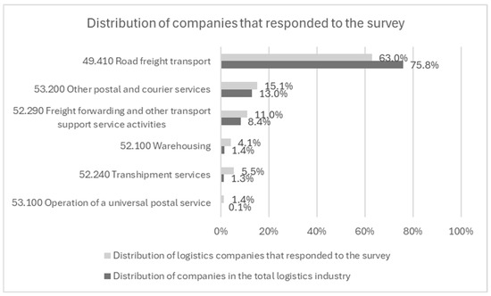 The target population included logistics companies classified under standard activity codes such as universal postal service activities, road freight transport, warehousing, cargo handling, and other transportation support activities. A total of 7217 companies were registered in Slovenia in this segment, as identified through the GVIN database [35]. However, public databases typically do not provide accessible contact information for these companies. To address this, the questionnaire was disseminated through the mailing lists of the Chamber of Commerce and Industry of Slovenia and the Chamber of Craft and Small Business of Slovenia. We chose this approach because the publicly available company database only lists generic information email addresses, to which firms typically do not respond. Consequently, not all companies were included in the survey, which represents a limitation of the study. Nevertheless, we believe that the sample includes representative stakeholders. Structured interviews with selected industry stakeholders were conducted to refine the questionnaire, ensuring clarity and consistency in interpretation. Feedback led to iterative improvements before the survey’s distribution.