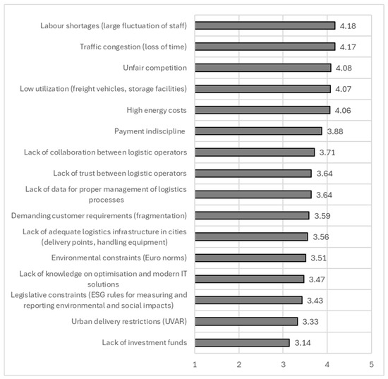 When examining the issues faced by logistics companies, we presented the respondents with 16 of the most common challenges identified from the literature review (Figure 2). The identified challenges were ranked based on how significantly they affect logistics processes. A rating of 1 indicates that the challenge does not significantly impact companies’ logistics processes, while a rating of 5 indicates that the issue has a very significant impact.