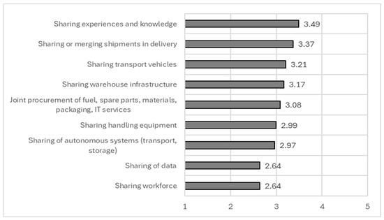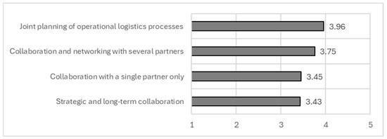 An analysis shows that the most suitable forms of collaboration are joint planning of operational logistics processes (3.96) and collaboration and networking with several partners (3.75); these are further interpreted in the following section. The standard deviation values (1.0–1.2) and the coefficient of variation (0.3) suggest a moderate spread in responses, indicating relative agreement among participants.