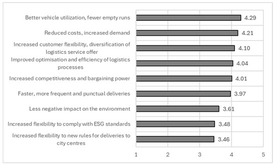 The results highlight that better vehicle utilization (4.29), cost reduction (4.21), and increased service diversification (4.10) are the most important benefits of collaboration, while increased flexibility to new rules for deliveries to city centres (3.46), increased flexibility to comply with ESG standards (3.48), and lower negative impact on the environment (3.61) are the least influential. The Discussion section offers a more comprehensive analysis of these results. The standard deviation values (0.7–1.1) and the coefficient of variation (0.2–0.3) indicate relatively low dispersion, suggesting a strong consensus on the benefits of collaboration. Only environmental and regulatory flexibility exhibits slightly higher dispersion, implying more diverse perspectives on their importance compared to efficiency and cost-related benefits.