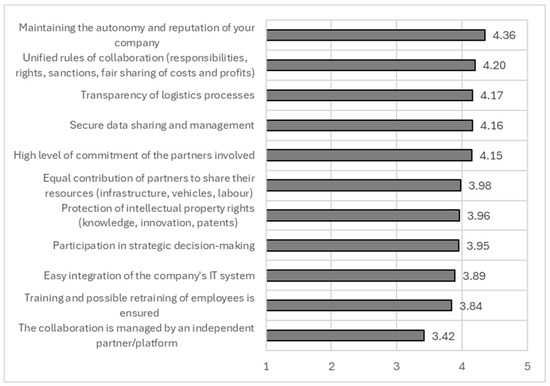 Regarding company size, large and medium-sized logistics companies tend to consider most of the listed collaboration conditions as important, whereas micro and small enterprises show lower awareness of their significance. For large companies, maintaining autonomy and company reputation, having unified rules of collaboration, involving an independent platform or partner for collaboration management, and ensuring a high level of partner commitment are particularly important. A more in-depth interpretation is provided in Section 4.