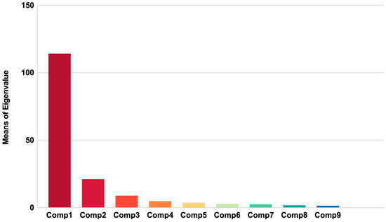 Based on the aforementioned “3322” theoretical framework, the original indicator system covers four dimensions: formative process, key drivers, support systems, and defining characteristics. It includes 10 primary indicators and several secondary/tertiary indicators, comprehensively reflecting the constituent elements of new quality productive forces. After standardization (Z-score standardization), all indicators were analyzed using PCA in Stata 17. To conduct an in-depth analysis of the key factors influencing new quality productive forces, this study employed principal component analysis (PCA) to perform dimensionality reduction on the multidimensional data. PCA is a commonly used dimensionality reduction technique that transforms multiple highly correlated variables into a few comprehensive principal components to better extract the main features of the data and eliminate noise. During this process, all variables were standardized to ensure they had the same units and standard deviations.