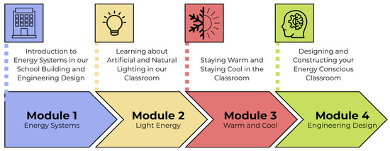 The Energy and Your Environment (EYE) curriculum is a six-week unit designed to support energy education for formal middle school science classrooms by employing green building science [8] (see links to open-access curricular materials in Supplementary File S2). This standards-aligned unit fosters place-based education by using the school building to enhance students’ systems thinking about energy consumption and energy flow between buildings and Earth systems. It consists of four modules (Figure 2). Module 1 introduces energy systems and energy transfer in the school building and introduces students to the engineering design challenge they will complete throughout the unit. Module 2 introduces learners to the ways in which natural and artificial lighting in the classroom relates to energy consumption. Module 3 extends this learning into heating, ventilation, and cooling (HVAC) systems. The unit then culminates in Module 4, in which students participate in a team-based engineering design project where they design an energy-efficient one-room schoolhouse.