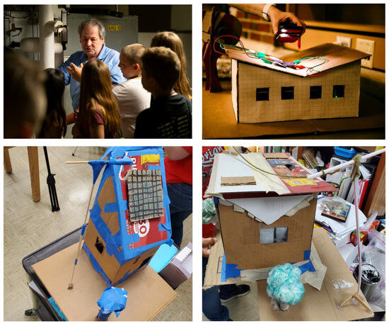 ST is supported throughout these modules, as energy is framed as a system wherein energy transfers and transforms. The specific forms of energy of focus in EYE are electrical, light, and thermal energies that readily pertain to green building concepts. To support classroom teachers in implementing systems thinking, the curriculum design team created a system model (Figure 3) that was used to guide the curriculum content and served as a resource for teachers. Figure 4 shows images of unit enactment, including building tours, light metering, and the engineering design outcomes.